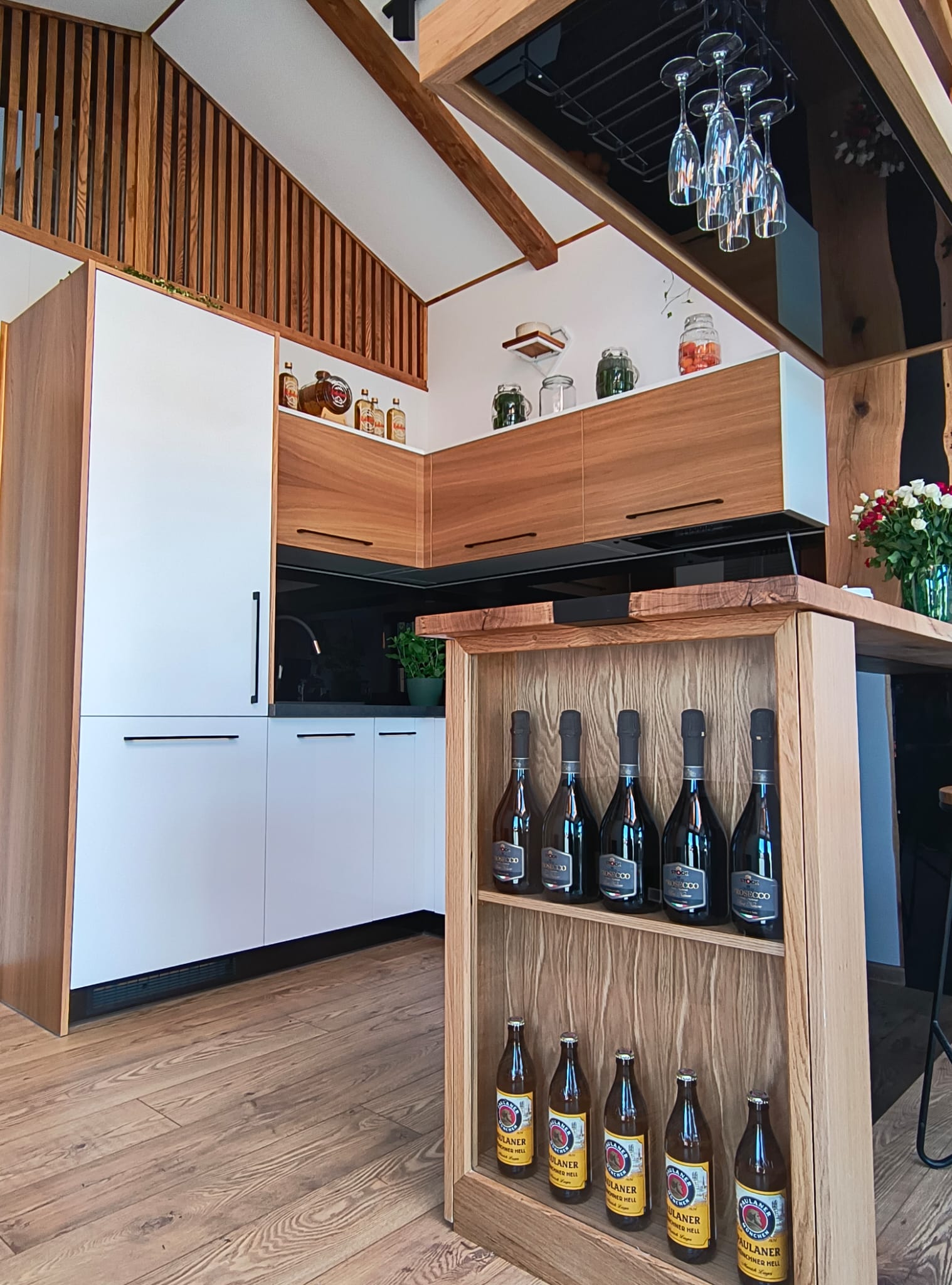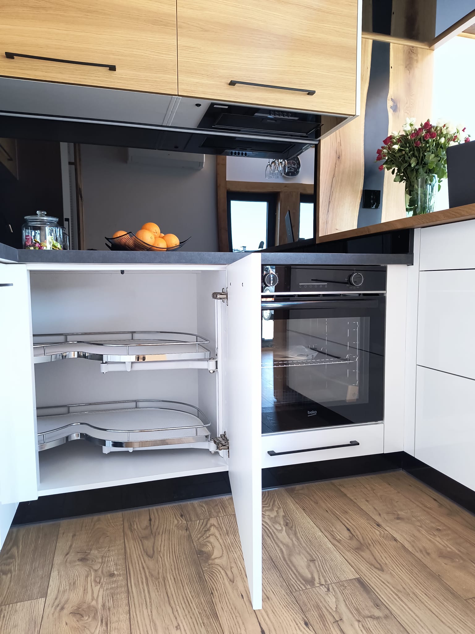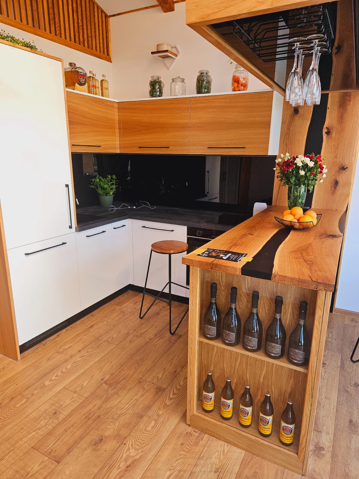 - Offene Küche mit Eckmöbeln ( weiß/eiche, schwarze Akzente )