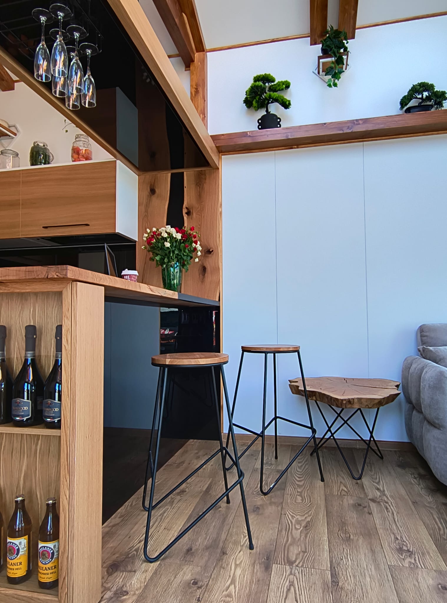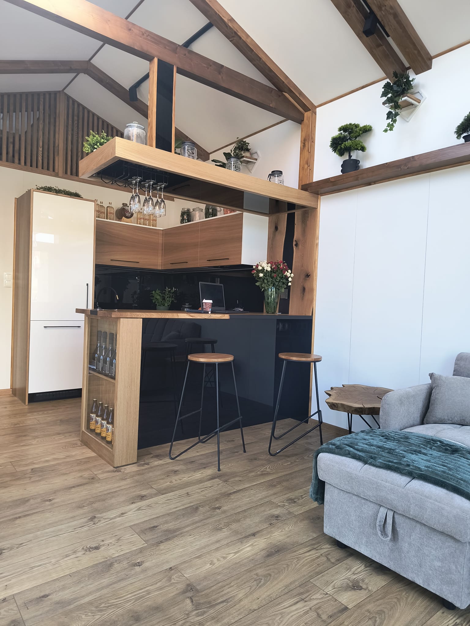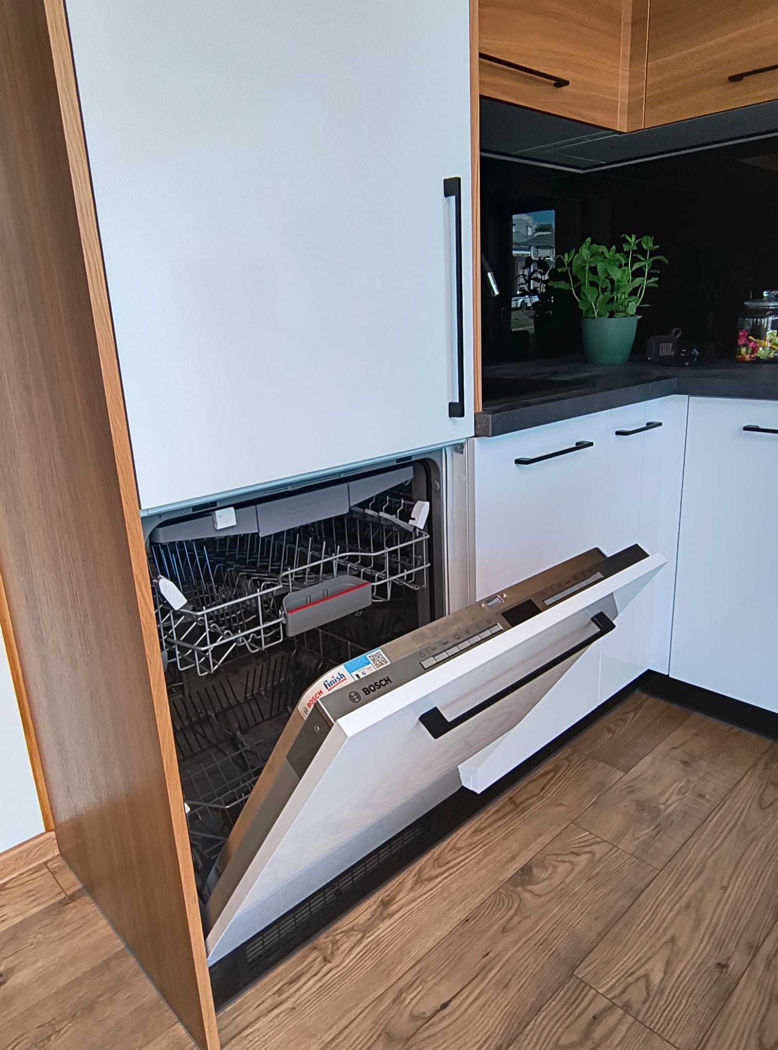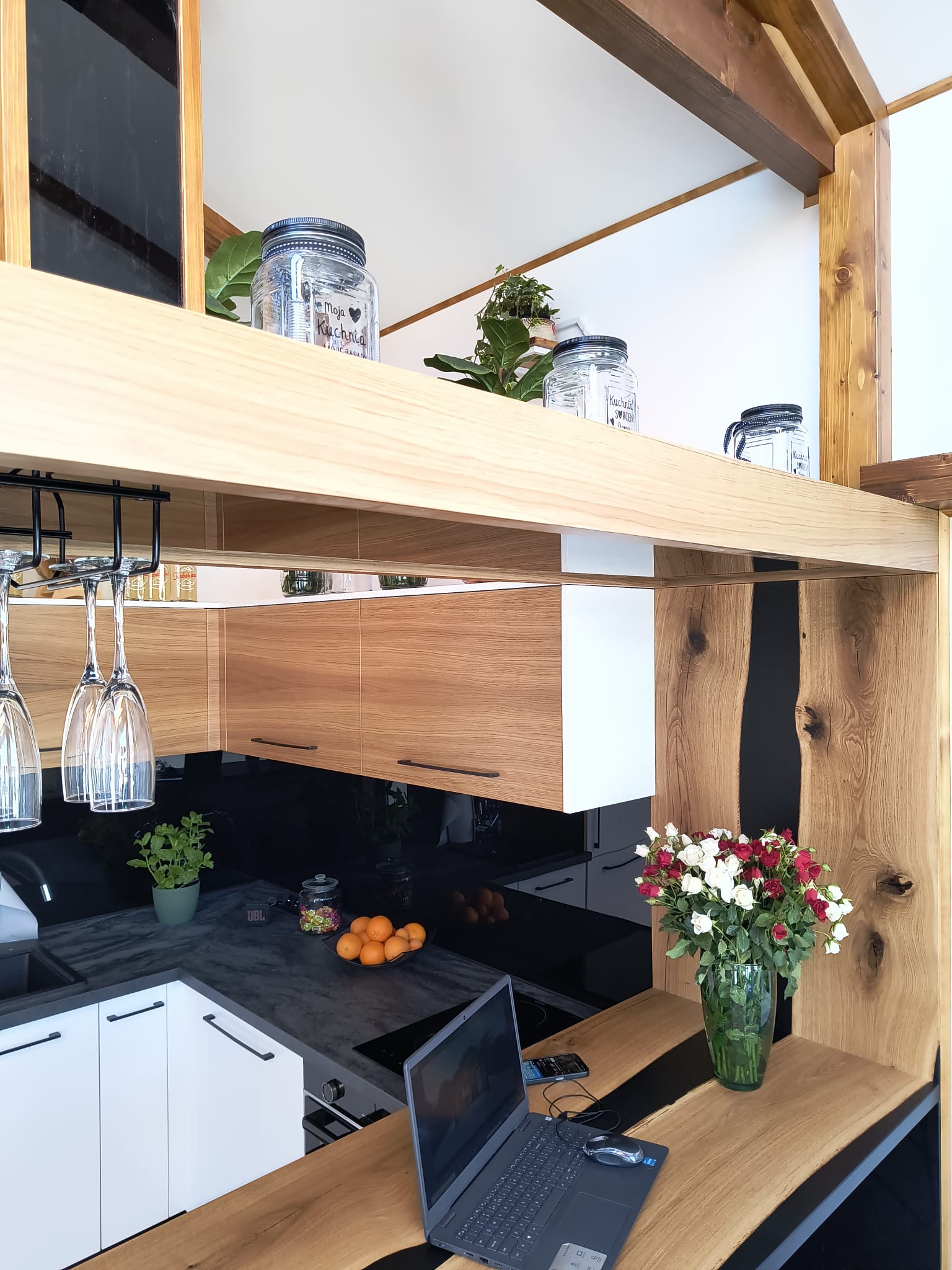 - Offene Küche mit Eckmöbeln ( weiß/eiche, schwarze Akzente )