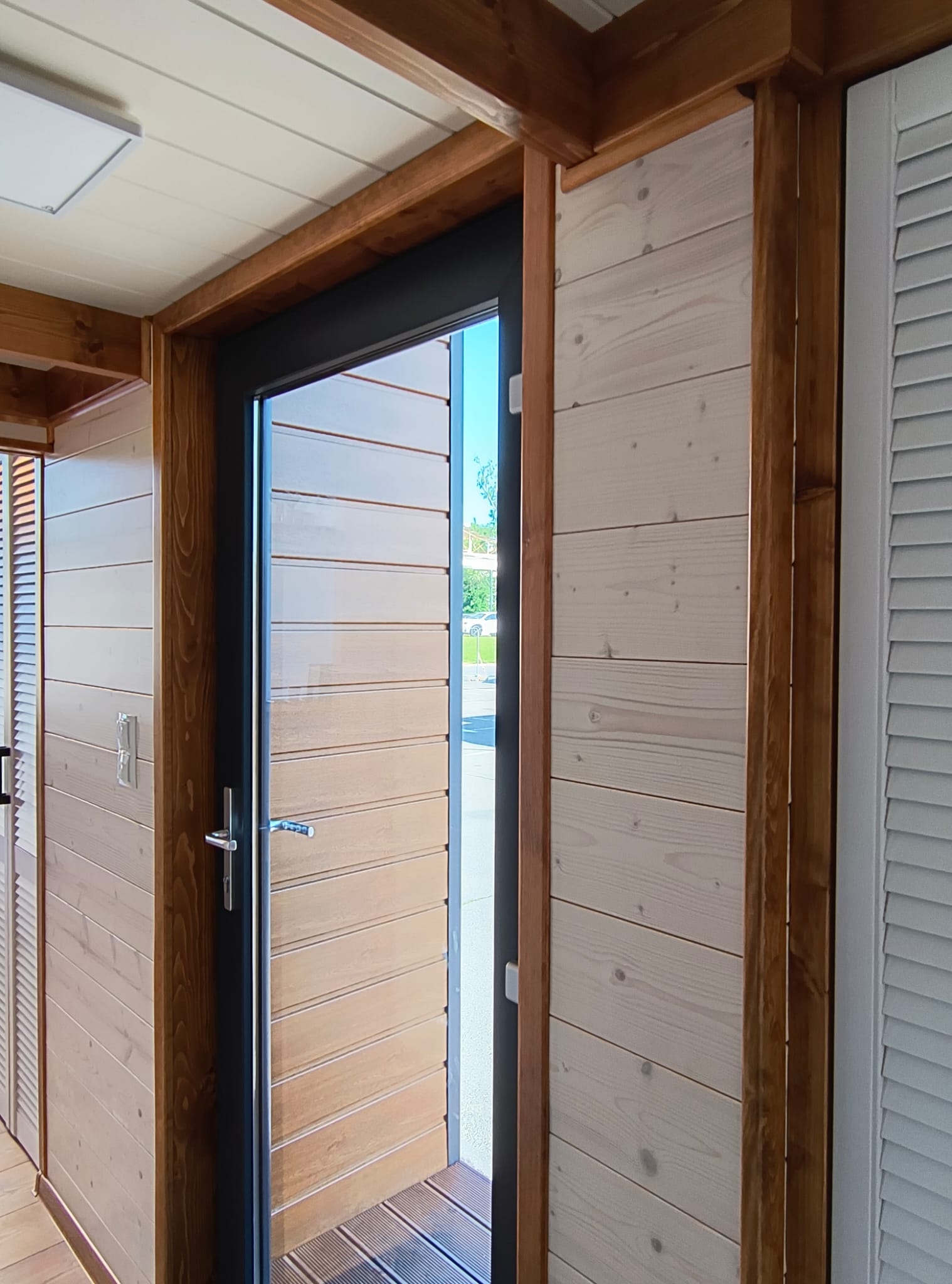- Abgeschlossen mit weißer Holztür, schwarzen Lampen und großem, zu öffnendem Fenster mit Ausgang