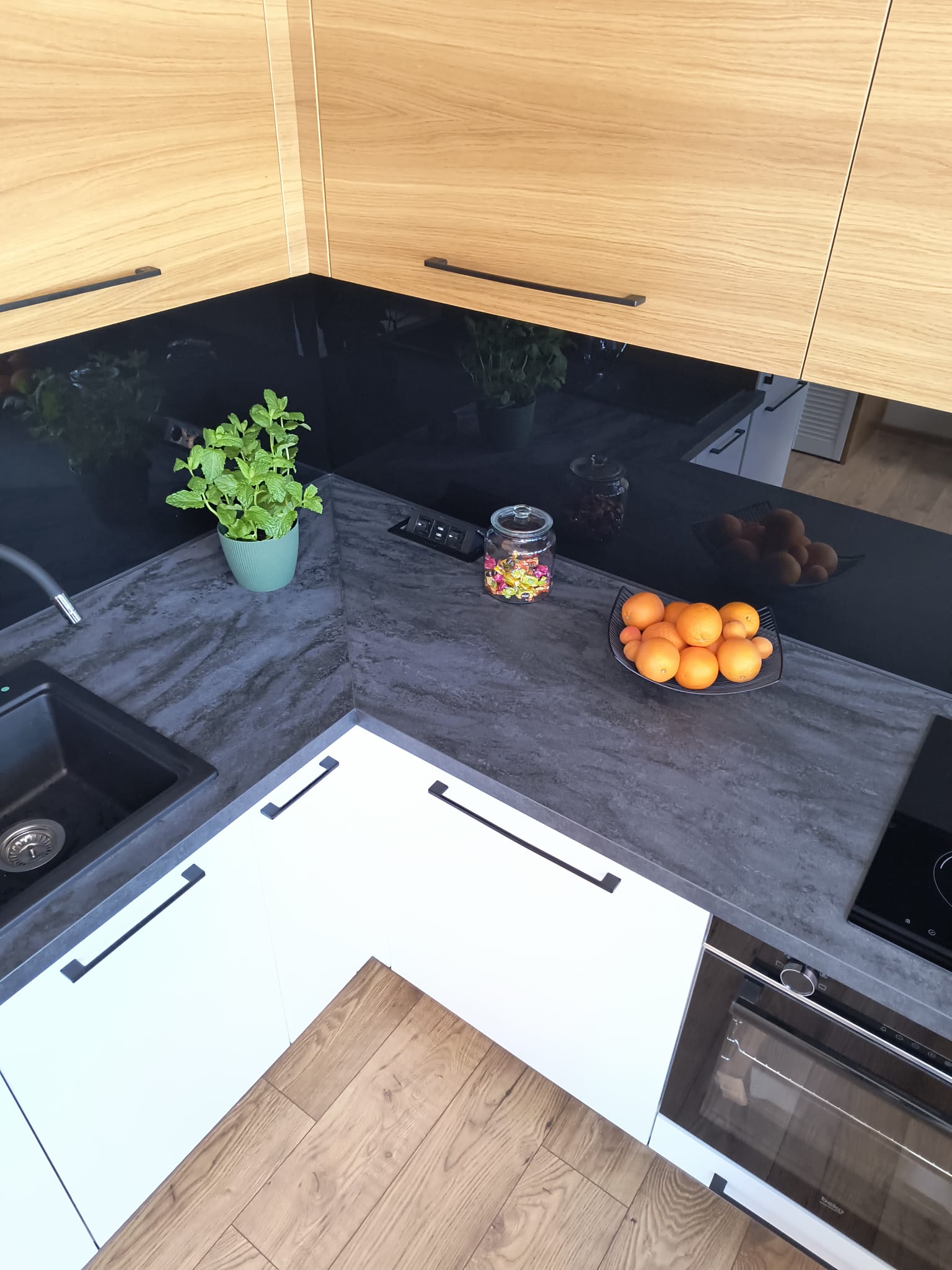 - Große Schubladen, Cargo-System, schwarzes Spülbecken mit Armaturen